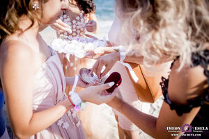Цялата сватба представляваше морска плажна сватба в тесен кръг. Украсата в ресторанта беше направена лично от булката, а нейното нареждане по масите в ресторанта бе отговорност на младоженеца. Тъкмо пристигайки като сватбен фотограф и сватбен видео оператор ( или накратко казано сватбено фото и видео ) го заварихме да прави именно това.